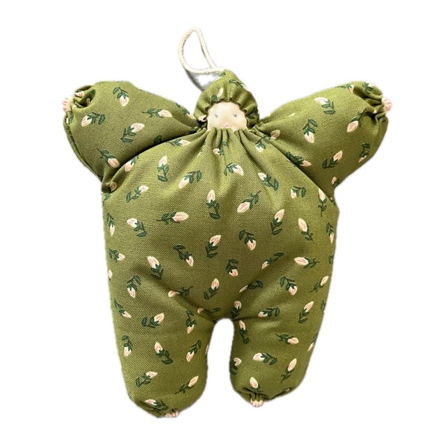 穏やかなグリーンにレトロかわいい小花模様のコットン生地です。 サイズ約17×17㎝ 厚さ約7㎝ お腹の中に、鈴が入っています(プラスチック製)ので お洗濯は不可です。 汚れた場合、部分洗いをおすすめいたします◎