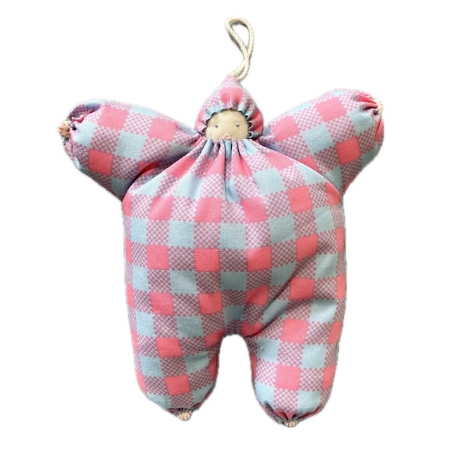 ピンクとブルーの仲良しギンガムチェック模様のコットン生地です。 サイズ約17×17㎝ 厚さ約7㎝ お腹の中に、鈴が入っています(プラスチック製)ので お洗濯は不可です。 汚れた場合、部分洗いをおすすめいたします◎