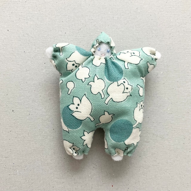お守りサイズのお人形のブローチタイプです^^ カバンに付けたり、胸元に飾ったり。 軽いので、Tシャツに付けてもふんわりしたつけ心地です◎ サイズは横6cm縦7cm 手のひらにすっぽり収まるか、指でつまむくらいの大きさです^^ 生地はコットン。 ブルーグリーンにキラキラ模様です◎ お顔と手足はフェルトです^^