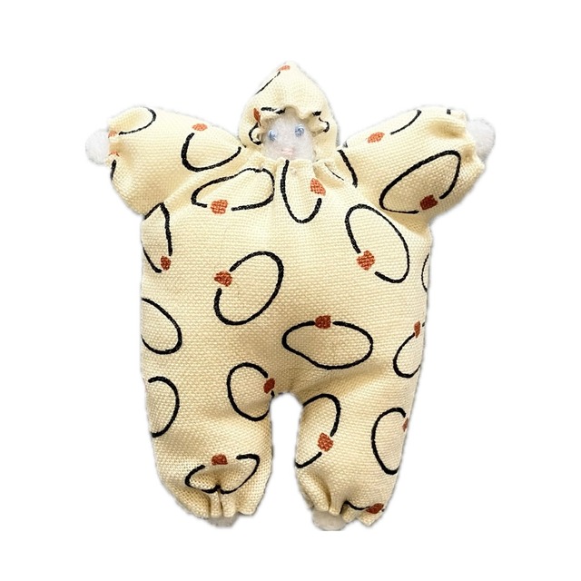お守りサイズのお人形のブローチタイプです^^ カバンに付けたり、胸元に飾ったり。 軽いので、Tシャツに付けてもふんわりしたつけ心地です◎ サイズは横6cm縦7cm 手のひらにすっぽり収まるか、指でつまむくらいの大きさです^^ 生地はコットン。 クリーム色に繊細な指輪のような模様です◎ お顔と手足はフェルトです^^