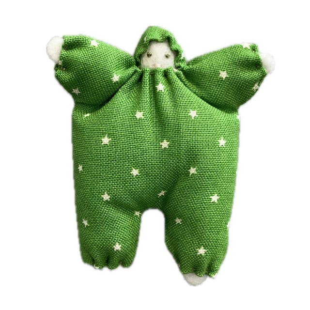 お守りサイズのお人形のブローチタイプです^^ カバンに付けたり、胸元に飾ったり。 軽いので、Tシャツに付けてもふんわりしたつけ心地です◎ サイズは横6cm縦7cm 手のひらにすっぽり収まるか、指でつまむくらいの大きさです^^ 生地はコットン。 鮮やかなライトグリーンに水玉模様のような星模様です◎ お顔と手足はフェルトです^^