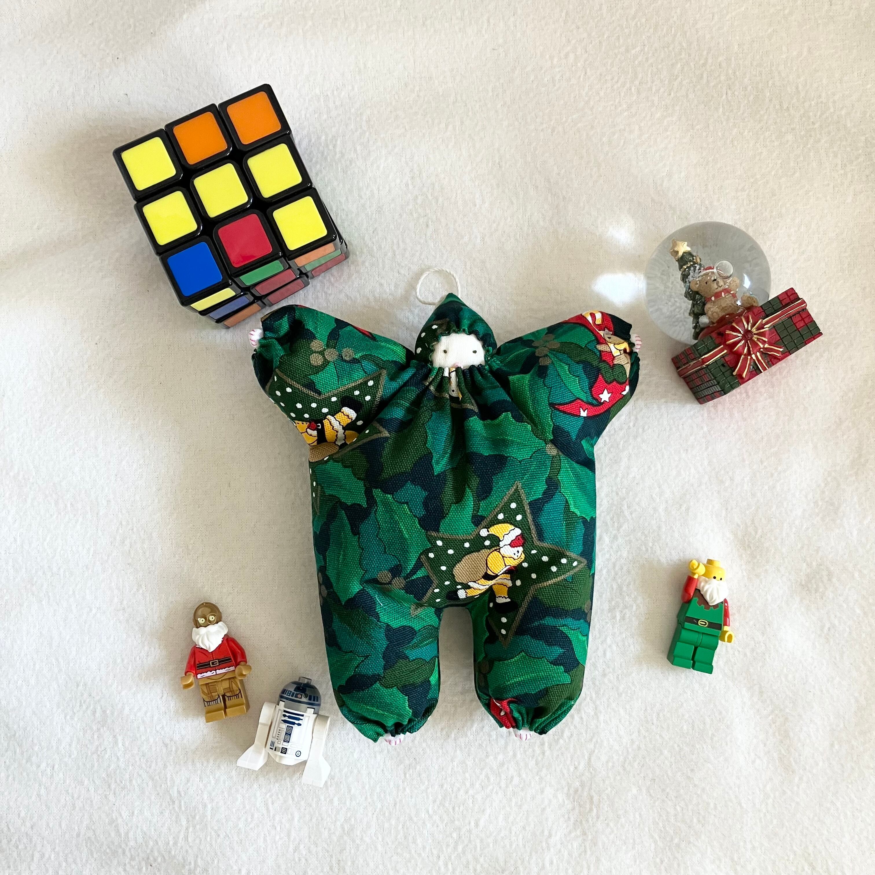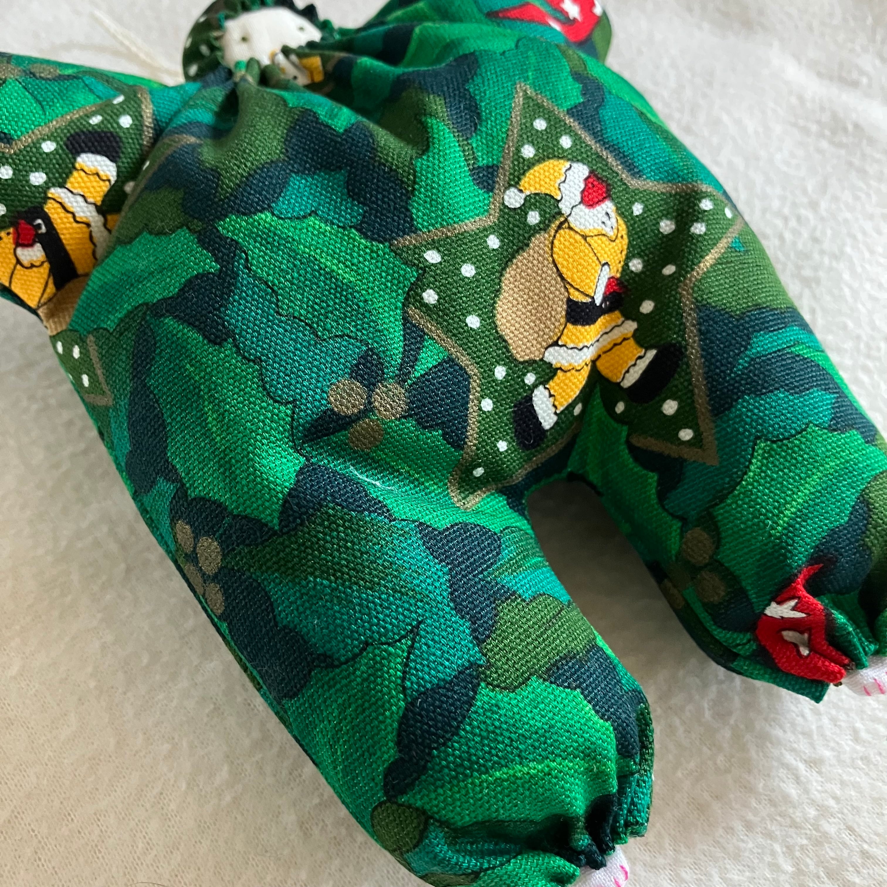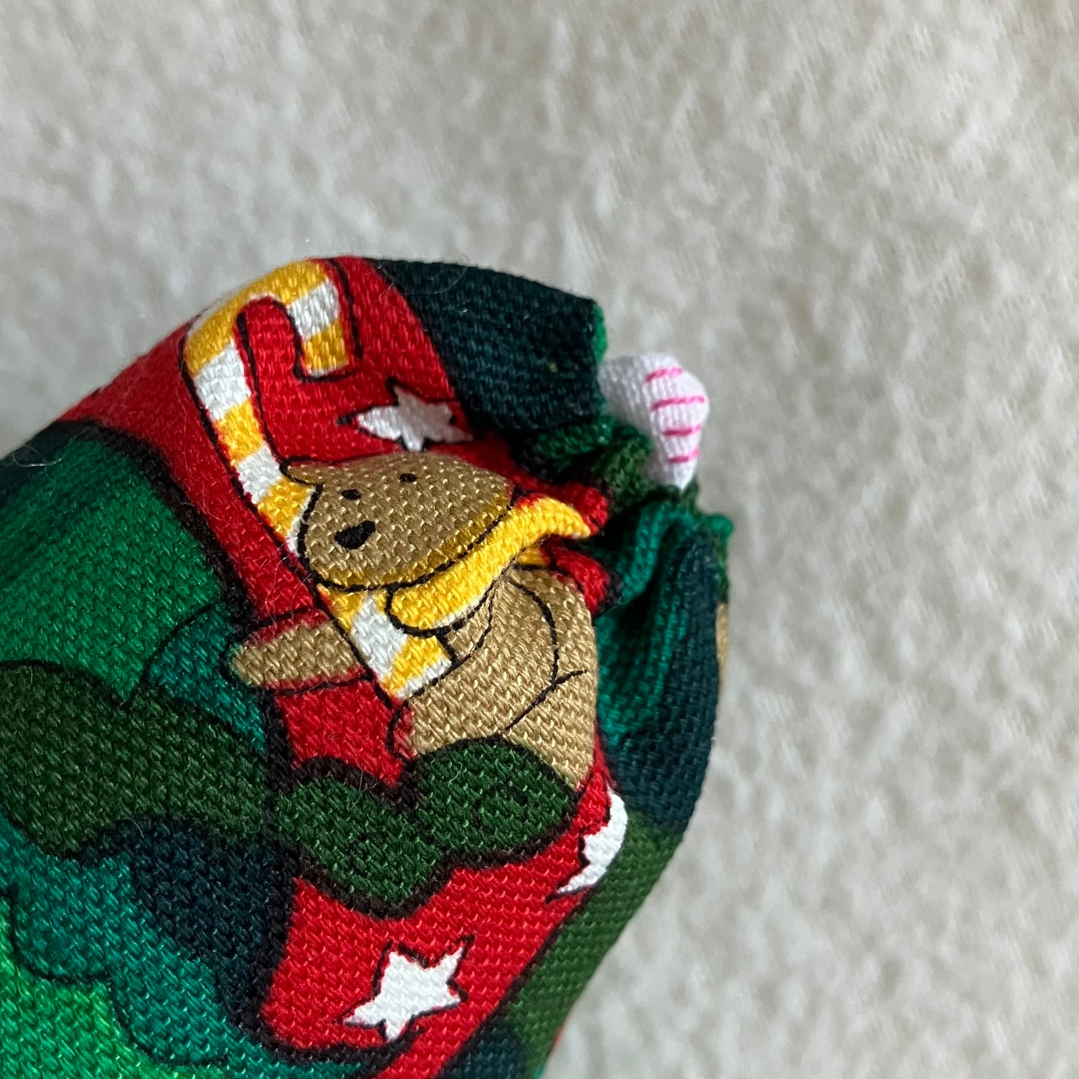 豊かなグリーンの柊と雪の中働くサンタさん。裏は真っ赤な月に腰掛けるクマちゃん模様のコットン生地です。しっかりめの触り心地の生地です。